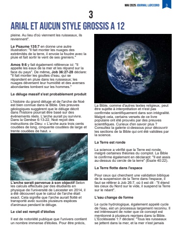 mai 2025Journal L@ccord 3Arial et aucun style grossis a 12La Bible, comme d'autres textes religieux, peut %u00eatre sujette %u00e0 interpr%u00e9tation et n'est pas confirm%u00e9e scientifiquement dans son int%u00e9gralit%u00e9. Malgr%u00e9 cela, certains versets de ce livre populaire ont %u00e9t%u00e9 prouv%u00e9s par des preuves scientifiques. Curieux d'en savoir plus ? Consultez la galerie ci-dessous pour d%u00e9couvrir les sections de la Bible qui ont %u00e9t%u00e9 valid%u00e9es par la science.La Terre est rondeLa science a v%u00e9rifi%u00e9 que la Terre est ronde, malgr%u00e9 certaines th%u00e9ories du complot. La Bible le confirme %u00e9galement en d%u00e9clarant: \au-dessus du cercle de la terre\La Terre flotte dans l'espacePour ceux qui cherchent une validation biblique de la suspension de la Terre dans l'espace, il faut se r%u00e9f%u00e9rer %u00e0 Job 26:7, o%u00f9 il est dit : \les cieux du Nord sur le vide, il suspend la Terre sur le n%u00e9ant\L'eau change de formeLe cycle hydrologique, %u00e9galement appel%u00e9 cycle de l'eau, est un processus largement reconnu. Il est int%u00e9ressant de noter que ce concept est mentionn%u00e9 %u00e0 plusieurs reprises dans la Bible. L'Eccl%u00e9siaste 1:7 d%u00e9clare: \se jettent dans la mer, et la mer n'est jamais pleine. Au lieu d'o%u00f9 viennent les ruisseaux, ils reviennent\Le Psaume 135:7 en donne une autre illustration: \extr%u00e9mit%u00e9s de la terre, il envoie la foudre avec la pluie et fait sortir le vent de ses greniers.\Amos 9:6 y fait %u00e9galement r%u00e9f%u00e9rence ici: \appelle les eaux de la mer et les r%u00e9pand sur la face du pays\\r%u00e9pandent en pluie dans les ruisseaux; les nuages d%u00e9versent leur humidit%u00e9 et des averses abondantes tombent sur les hommes.\Le d%u00e9luge massif s'est probablement produitL'histoire du grand d%u00e9luge et de l'arche de No%u00e9 est bien connue dans la Bible. Des preuves g%u00e9ologiques sugg%u00e8rent que le d%u00e9luge d%u00e9crit dans l'histoire pourrait %u00eatre bas%u00e9 sur des %u00e9v%u00e9nements r%u00e9els. L'arche aurait pu survivre. Dans la Gen%u00e8se 6:13-22, No%u00e9 re%u00e7oit des instructions de Dieu: %u00ab L'arche aura trois cents coud%u00e9es de long, cinquante coud%u00e9es de large et trente coud%u00e9es de haut. %u00bbL'arche serait parvenue %u00e0 son objectif Selon les calculs effectu%u00e9s par des %u00e9tudiants en physique de l'universit%u00e9 de Leicester en 2014, il a %u00e9t%u00e9 d%u00e9couvert que le calcul de l'arche %u00e9tait exact. Cela signifie que l'arche aurait flott%u00e9 et transport%u00e9 avec succ%u00e8s plusieurs esp%u00e8ces d'animaux pendant le d%u00e9luge.Le ciel est rempli d'%u00e9toiles Il est de notori%u00e9t%u00e9 publique que l'univers contient un nombre immense d'%u00e9toiles. Pour %u00eatre pr%u00e9cis, 3